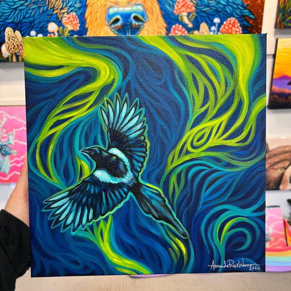 Flying Among the Aurora, Magpie Original Painting