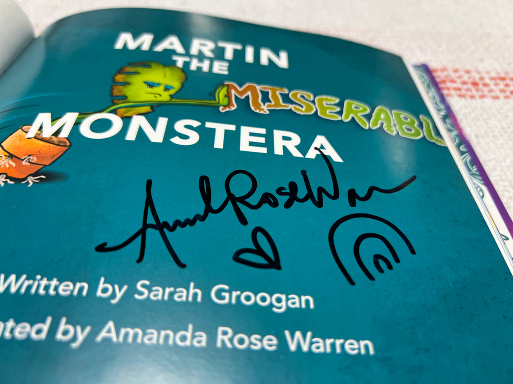 Bundle Includes: Coloring Book, colored pencils, Waterproof sticker heart sheet and signed by the artist ‘Martin the Miserable Monstera’ children’s book.